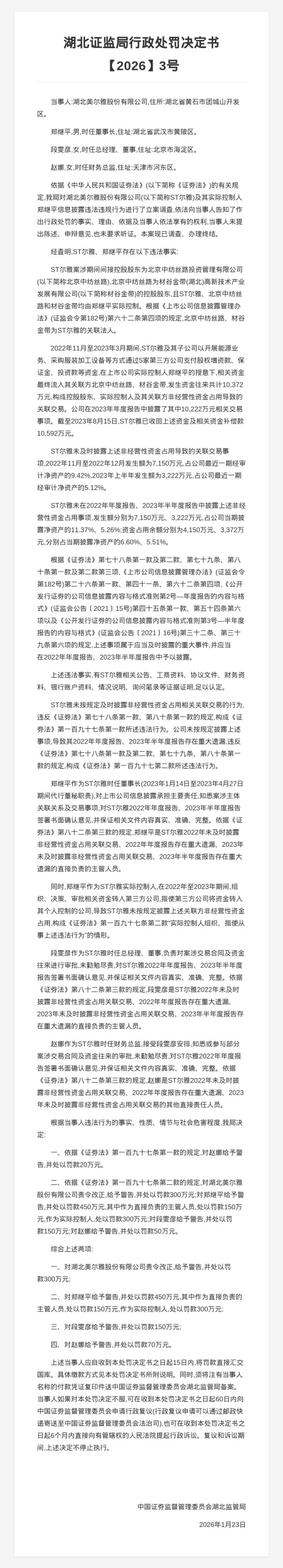 对此,中国证券监督管理委员会湖北监管局决定对湖北美尔雅股份有限公司责令改正,给予警告,并处以罚款300万元;对郑继平给予警告,并处以罚款450万元;对段雯彦给予警告,并处以罚款150万元;对赵娜给予警告,并处以罚款70万元。