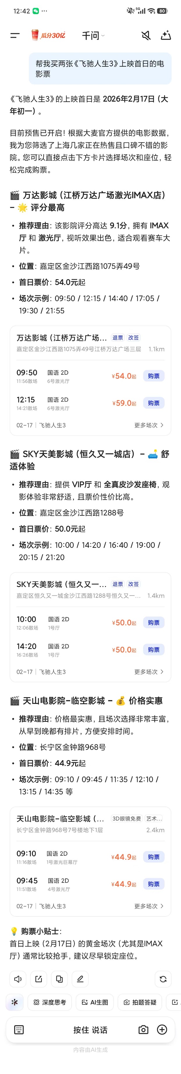 记者体验发现,在千问App,用户只需发出如“帮我买两张《飞驰人生3》上映首日的电影票”这样的指令,千问App即可化身“私人票务助理”。