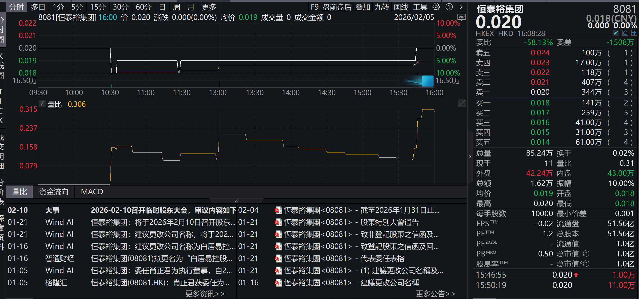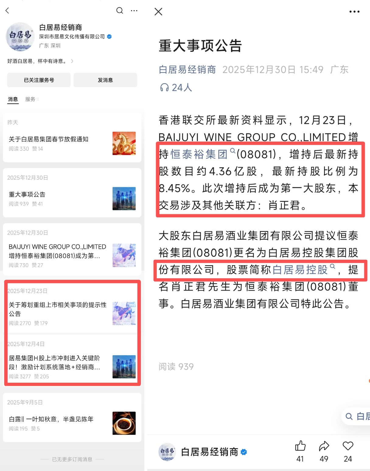 界面新闻记者在浏览于2025年9月才注册、累计仅发布过6条内容的“白居易经销商”官微后发现,所谓的IPO上市实则是收购在香港创业板挂牌的仙股恒泰裕集团(08081.HK)控制权并继而谋求更名的动作。