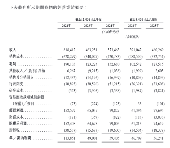 在业绩表现上,乐欣户外营收目前仍未达到2022年的高点,但2025年表现已优于2024年。招股书显示,2022年时,其收入一度达到8.18亿元,但在2024年则仅为5.73亿元,2025年前8个月则为4.60亿元。利润方面则同样如此,其2022年利润一度达到1.14亿元,但在2024年则仅为5941万元,2025年前8个月则为5624万元。