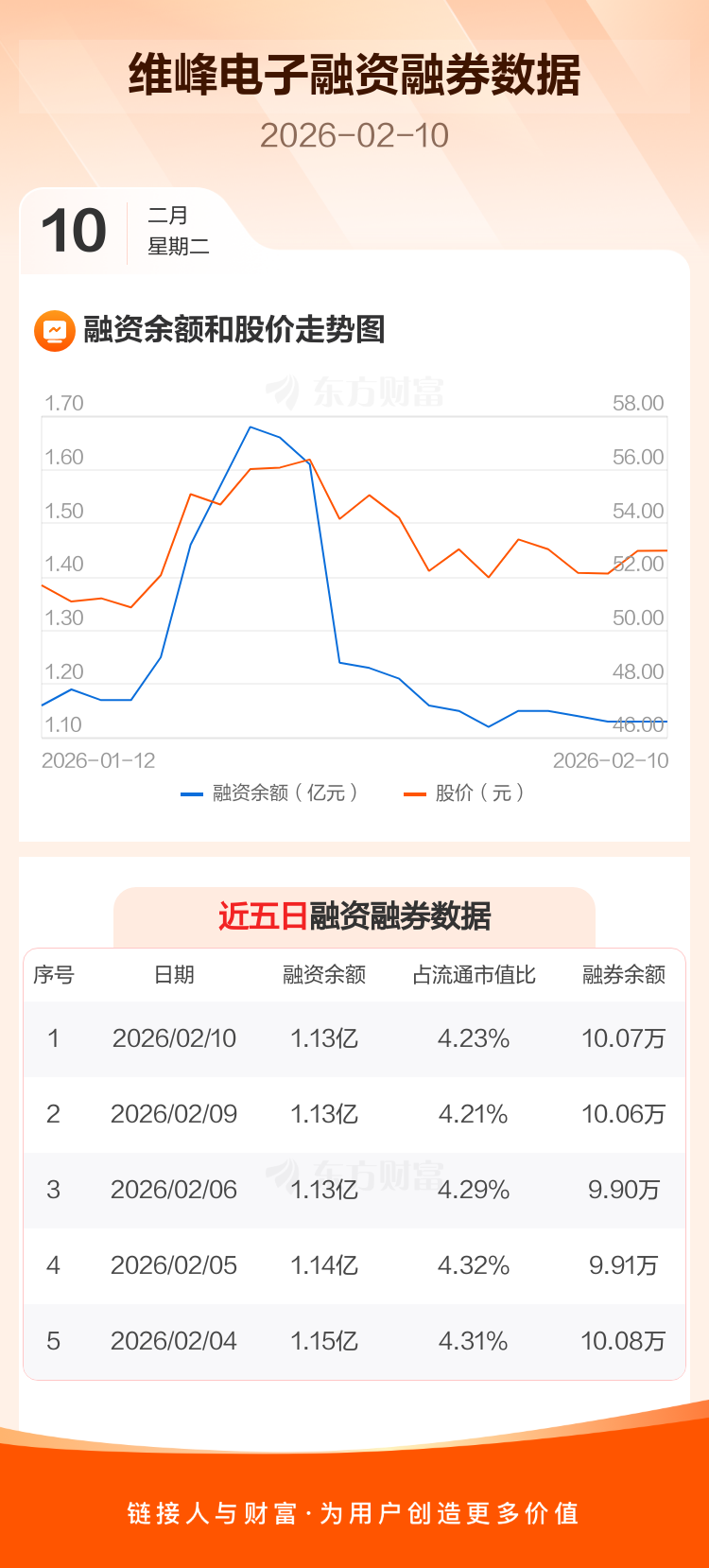 交易所最新数据显示,维峰电子于2026年2月10日获融资买入398.35万元,融资偿还354.60万元,当日融资净买入43.75万元。目前,该股融资余额1.13亿,占流通市值比例为4.23%。