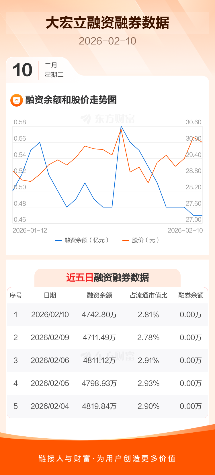 交易所最新数据显示,大宏立于2026年2月10日获融资买入224.88万元,融资偿还193.57万元,当日融资净买入31.31万元。目前,该股融资余额4742.80万,占流通市值比例为2.81%。