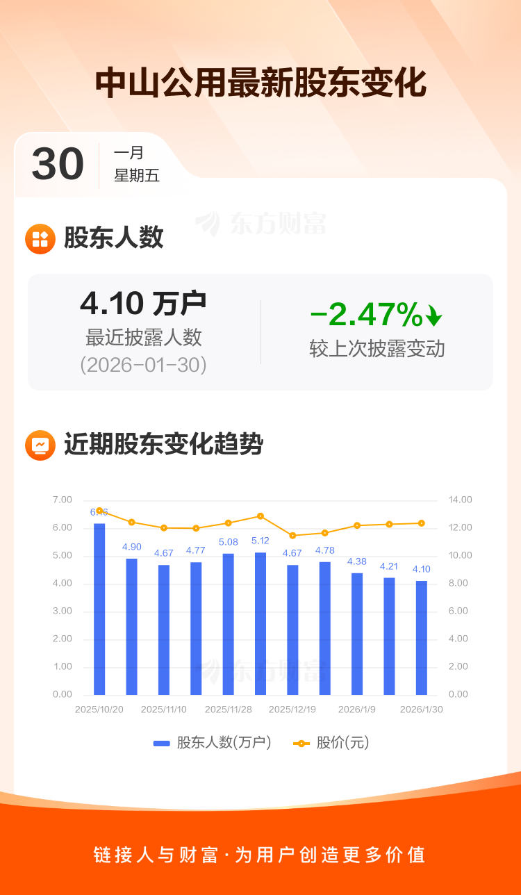 中山公用最新披露数据显示,截至1月30日公司股东户数为4.10万户,较上期(2026年1月20日)减少1039户,降幅为2.47%。户均持有流通股数量由上期的2.98万股上升至3.06万股,户均持股金额由上期的36.59万元增加至37.76万元。