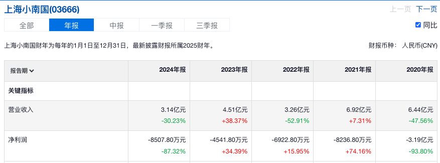业绩方面, 上海小南国 自2018年至今持续亏损。财报显示,截至2025年上半年, 上海小南国实现营收为1.02亿元,同比下降44.2%;期内亏损1825.3万元,亏损同比收窄37.9%。