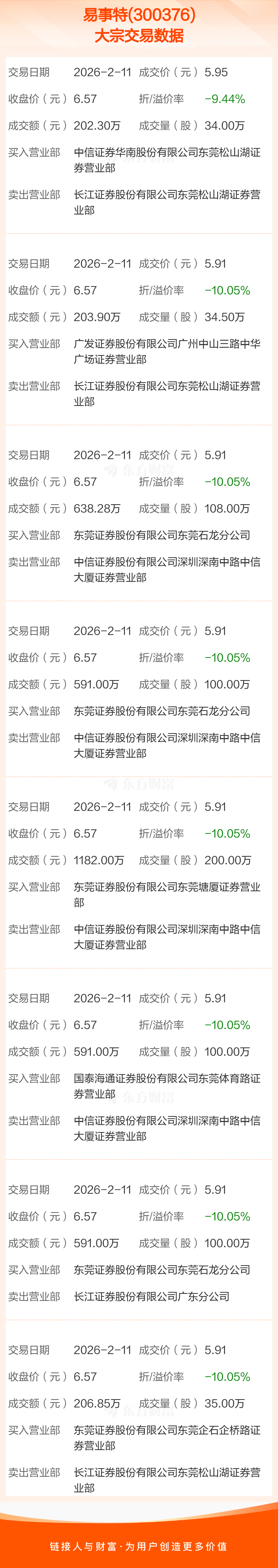 2026年2月11日,易事特发生8笔大宗交易,共成交711.50万股,成交金额4206.33万元,占其流通市值比例为0.28%。