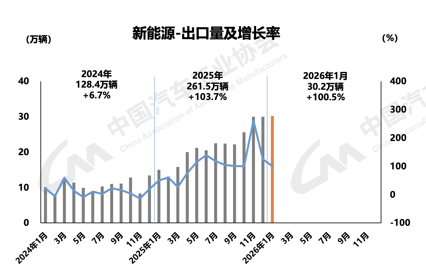 1月,新能源汽车出口30.2万辆,同比增长1倍,环比增长0.5%。其中,新能源乘用车出口29.5万辆,同比增长1.1倍,环比增长0.3%;新能源商用车出口0.6万辆,同比下降1.4%,环比增长9.9%。