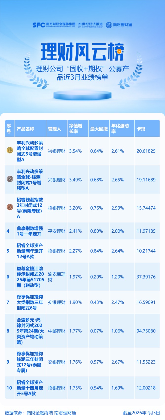 产品统计范围为理财公司发行的公募“固收+期权”理财产品,统计截止日期为2026年2月5日,统计区间为近3月。