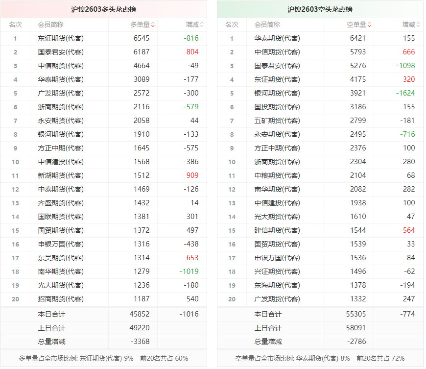 总体而言,沪镍2603合约今日减仓上行,多空持仓排名前20席中,多空双方均呈退场态势,多头退场意愿强于空头。