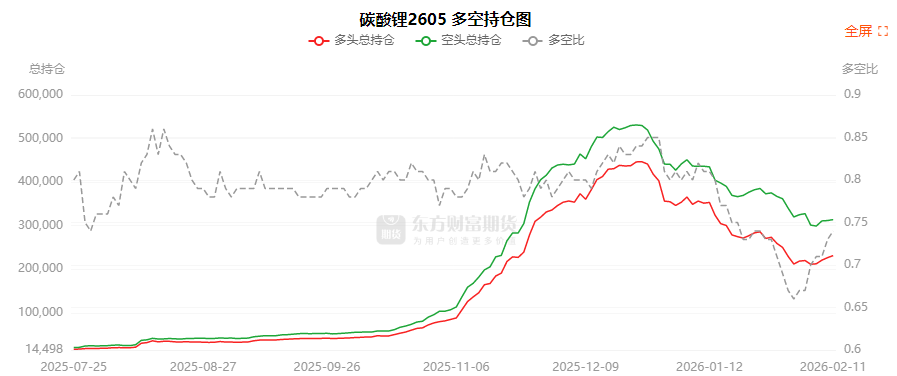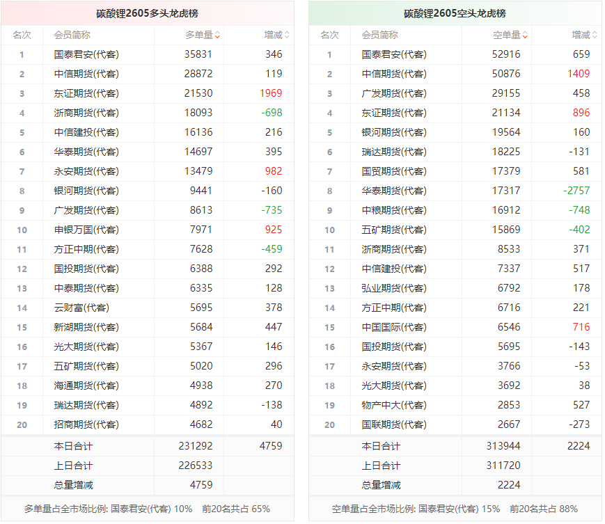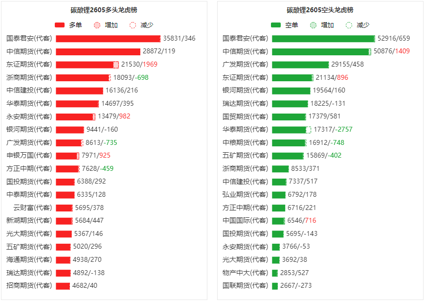 总体而言,碳酸锂2605合约今日增仓上行,多空持仓排名前20席中,多空双方均呈进场态势,多头进场意愿强于空头。