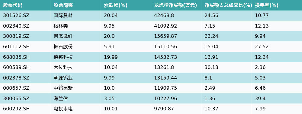 南财智讯2月11日电,盘后数据显示,因当日异动登上龙虎榜的个股中,资金净买入最多的前三位分别是国际复材(301526.SZ)、格林美(002340.SZ)与聚杰微纤(300819.SZ)。其中排名第一的国际复材净买额达4.25亿元,占总成交金额的24.56%。国际复材当日收盘上涨20.04%,换手率为10.77%,净买入额前10个股详情见下图:
