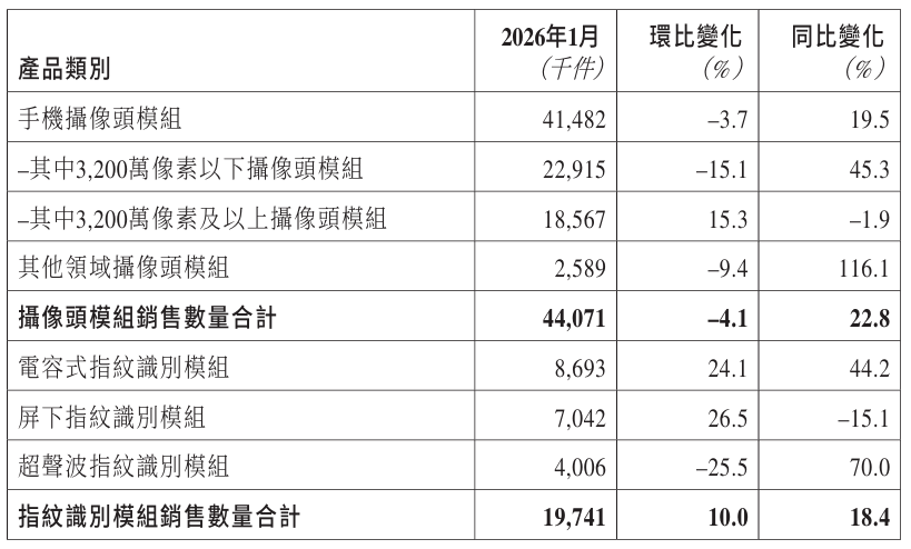 2月11日,丘钛科技(01478)发布公告,2026年1月,公司摄像头模组销售数量合计4407万件,同比增长22.8%;指纹识别模组销售数量合计1974万件,同比增长18.4%,具体数据如下: