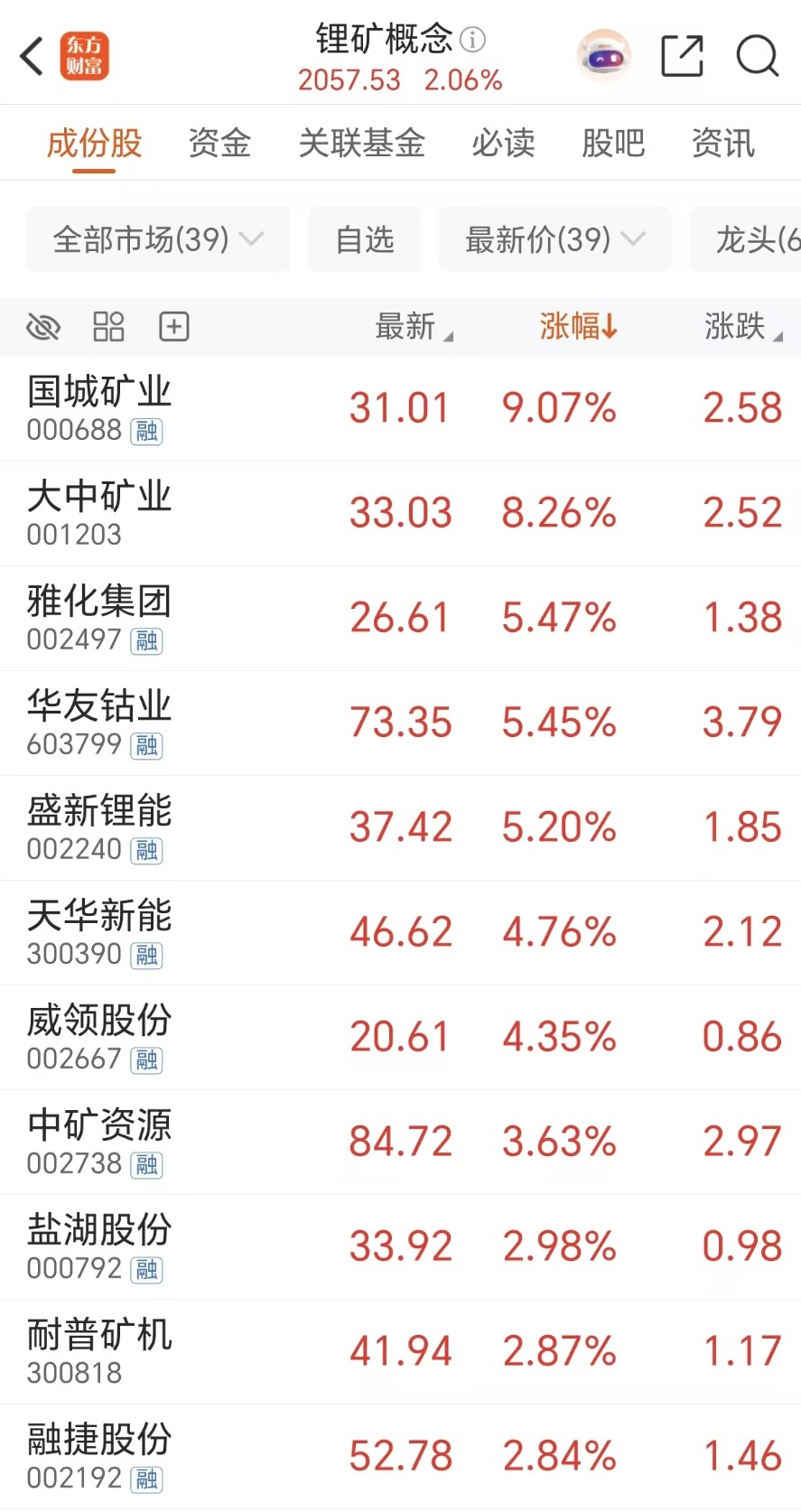 周三,能源金属强势,锂矿概念股领涨,国城矿业涨超9%,大中矿业、雅化集团等跟涨。