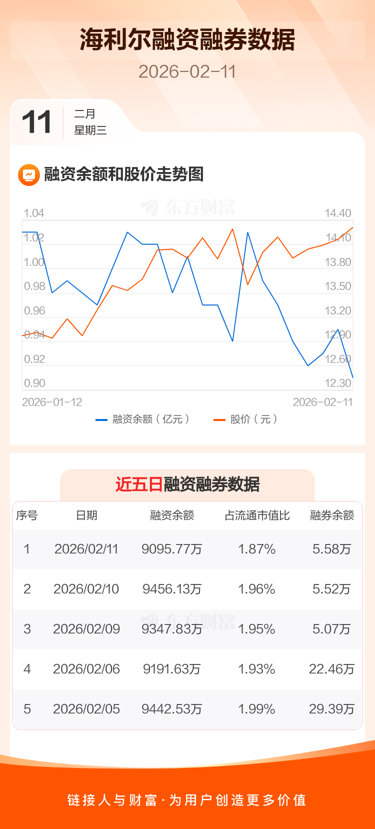 交易所最新数据显示,海利尔于2026年2月11日获融资买入569.03万元,融资偿还929.39万元,当日融资净偿还360.36万元。目前,该股融资余额9095.77万,占流通市值比例为1.87%。