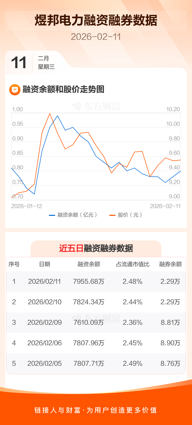交易所最新数据显示,煜邦电力于2026年2月11日获融资买入701.01万元,融资偿还569.66万元,当日融资净买入131.35万元。目前,该股融资余额7955.68万,占流通市值比例为2.48%。