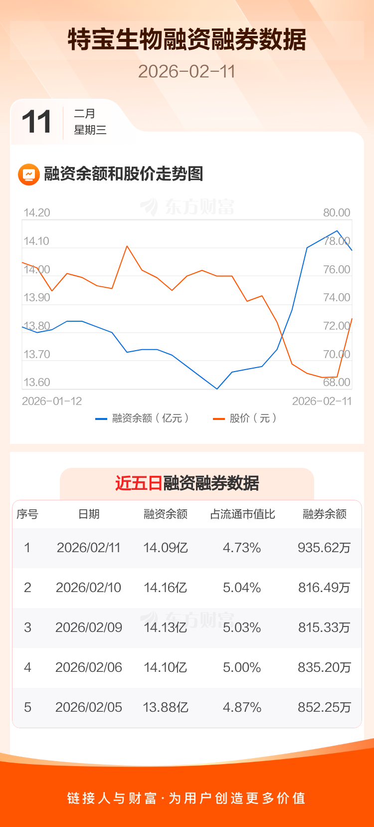 交易所最新数据显示,特宝生物于2026年2月11日获融资买入2823.45万元,融资偿还3502.18万元,当日融资净偿还678.73万元。目前,该股融资余额14.09亿,占流通市值比例为4.73%。