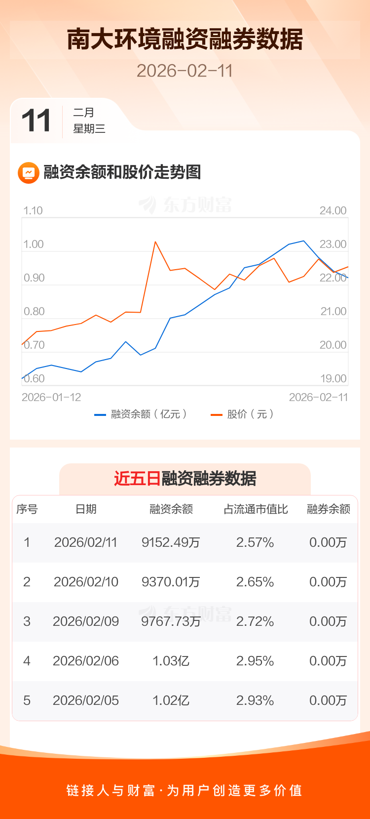 交易所最新数据显示,南大环境于2026年2月11日获融资买入248.69万元,融资偿还466.21万元,当日融资净偿还217.52万元。目前,该股融资余额9152.49万,占流通市值比例为2.57%。