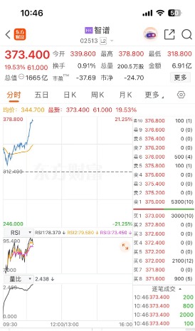 上证报中国证券网讯2月12日早盘,智谱盘中一度涨超21%。截至10时46分,智谱报373.4港元/股,涨19.53%。