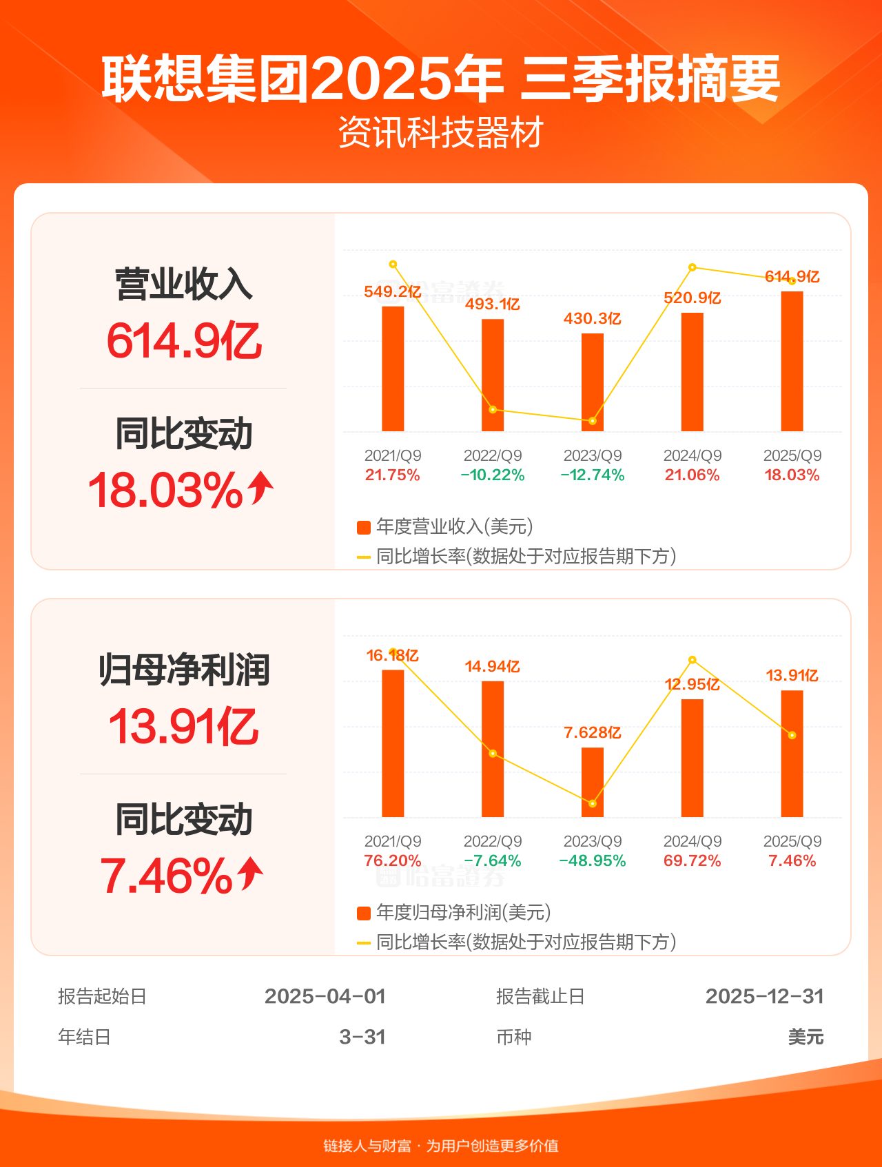 联想集团2月12日发布三季报业绩,截至2025年12月31日的9个月内,该公司营业收入614.86亿美元,同比增长18.03%;公司权益持有人应占溢利(归母净利润)13.91亿美元,同比增长7.46%。