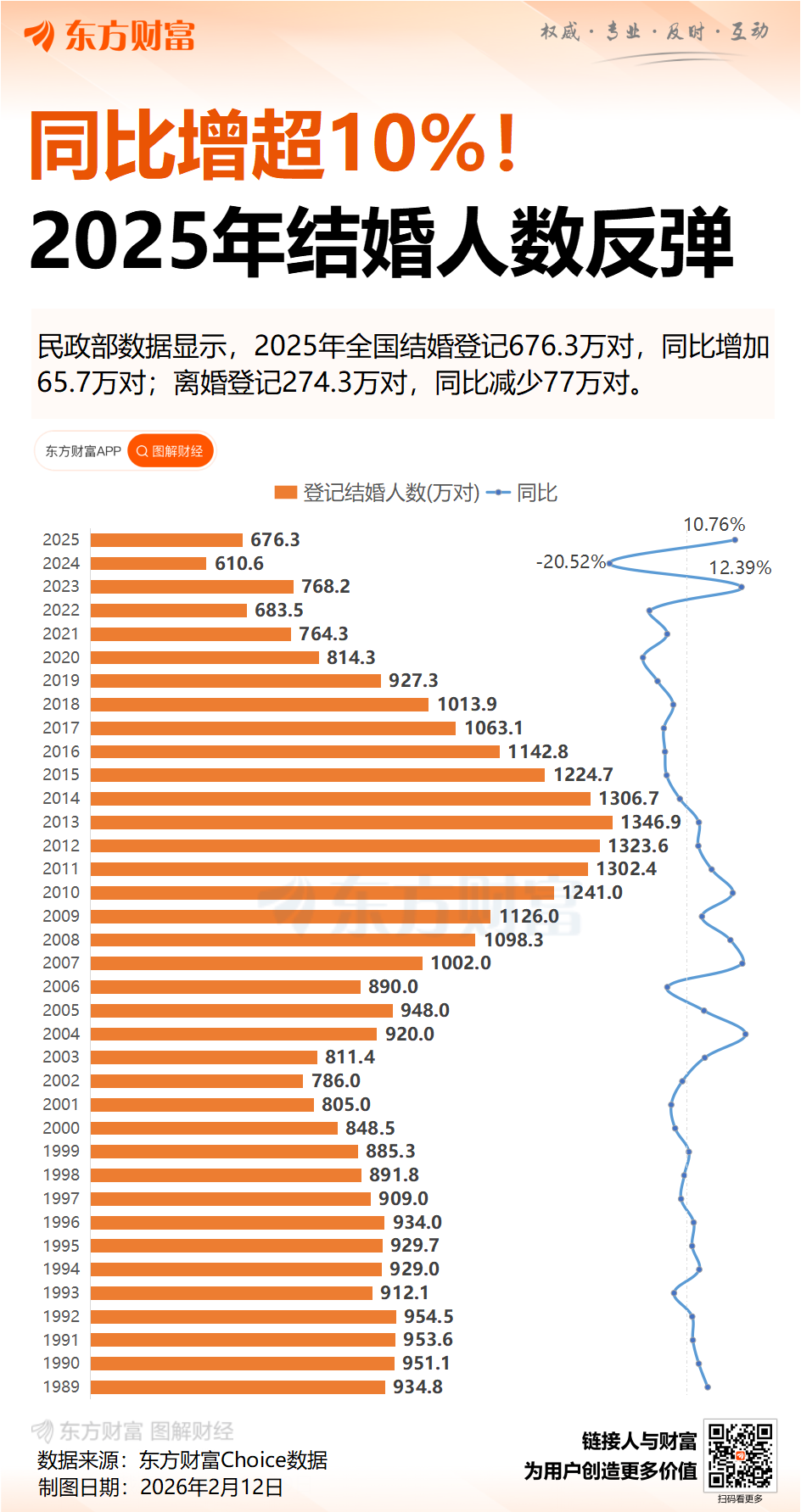 民政部2月11日公布2025年婚姻登记数据,结婚登记676.3万对,离婚登记274.3万对。