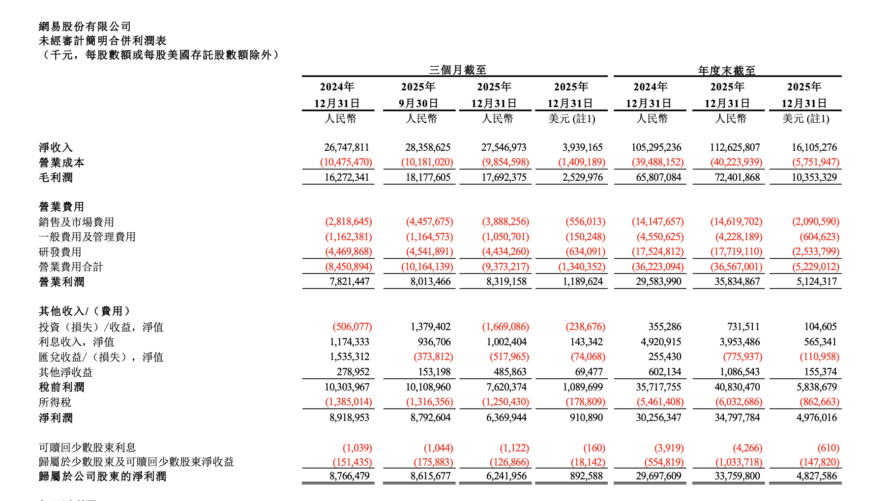 2月11日港股盘后,网易发布了2025年第四季度未经审计财务业绩及全年财报。