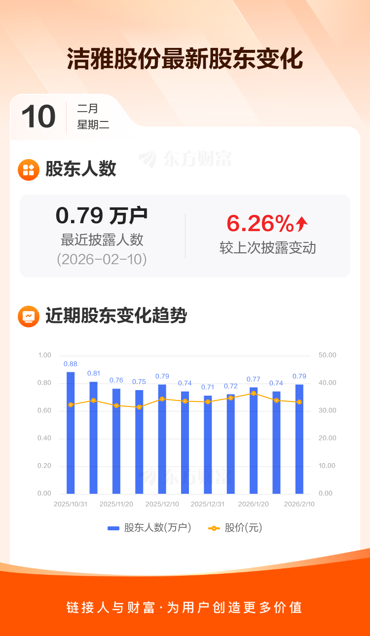 洁雅股份最新披露数据显示,截至2月10日公司股东户数为7871户,较上期(2026年1月31日)增加464户,增幅为6.26%。户均持有流通股数量由上期的8760股下降至8244股,户均持股金额由上期的29.58万元减少至27.36万元。