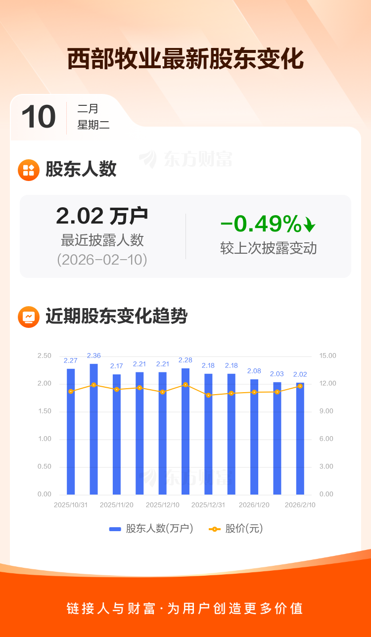 西部牧业最新披露数据显示,截至2月10日公司股东户数为2.02万户,较上期(2026年1月30日)减少100户,降幅为0.49%。户均持有流通股数量由上期的1.04万股上升至1.05万股,户均持股金额由上期的11.57万元增加至12.29万元。