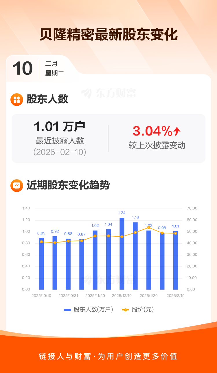 贝隆精密最新披露数据显示,截至2月10日公司股东户数为1.01万户,较上期(2026年1月30日)增加297户,增幅为3.04%。户均持有流通股数量由上期的2171股下降至2107股,户均持股金额由上期的10.61万元减少至10.23万元。