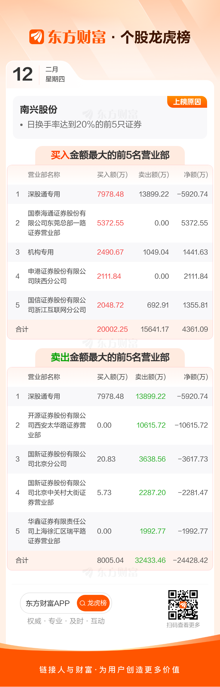 交易所2026年2月12日公布的交易公开信息显示,南兴股份因成为日换手率达到20%的前5只证券上榜。南兴股份当日收报25.67元,涨跌幅4.69%,偏离值31.45%,换手率31.69%,成交额22.36亿。