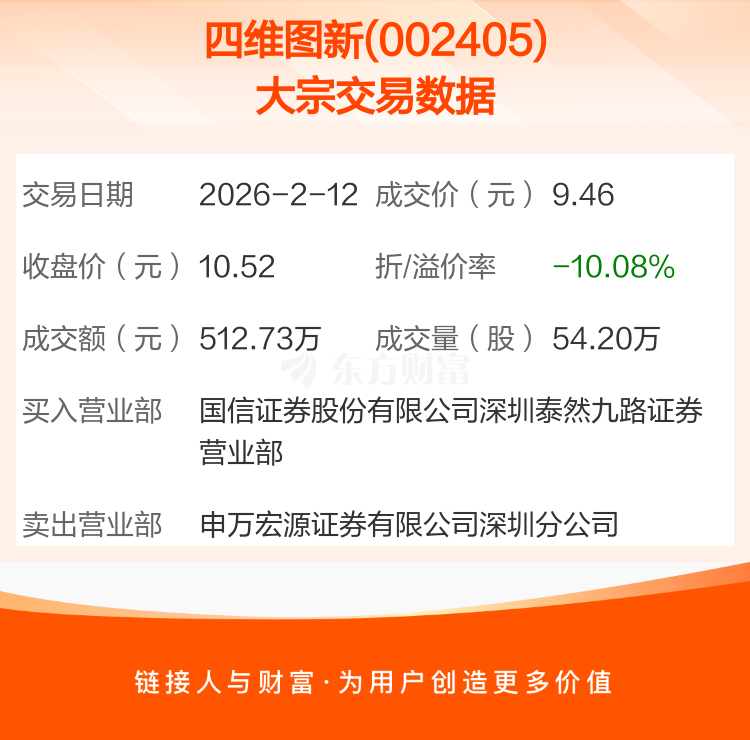2026年2月12日,四维图新发生1笔大宗交易,共成交54.20万股,成交金额512.73万元,占其流通市值比例为0.02%。