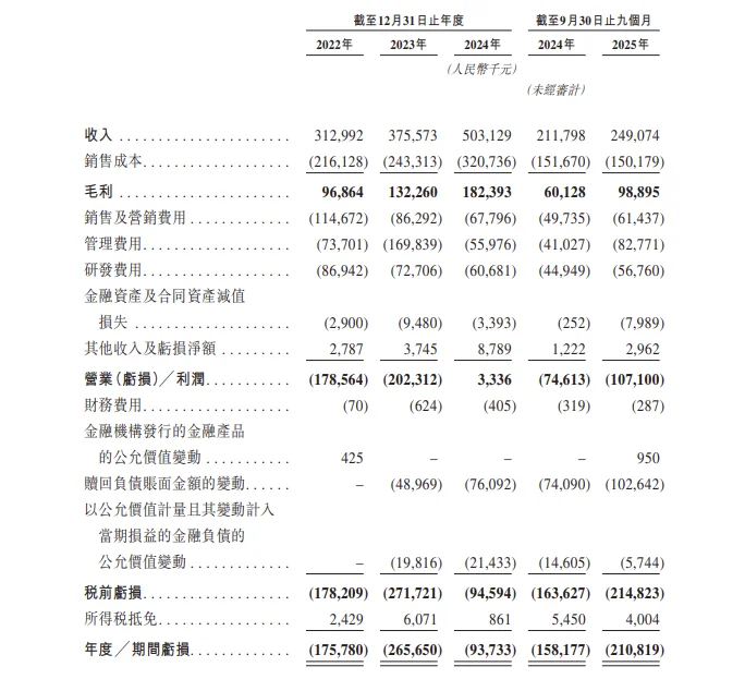 从2022年的人民币313.0百万元增长20.0%至2023年的人民币375.6百万元,并在2024年进一步增长34.0%至人民币503.1百万元。公司的毛利率由2022年的30.91%增至2023年的35.2%,并进一步增至2024年的36.3%。公司的总收入从截至2024年9月30日止九个月的人民币211.8百万元增长17.6%至2025年同期的人民币249.1百万元。公司的毛利率由截至2024年9月30日止九个月的28.4%增至2025年同期的39.7%。