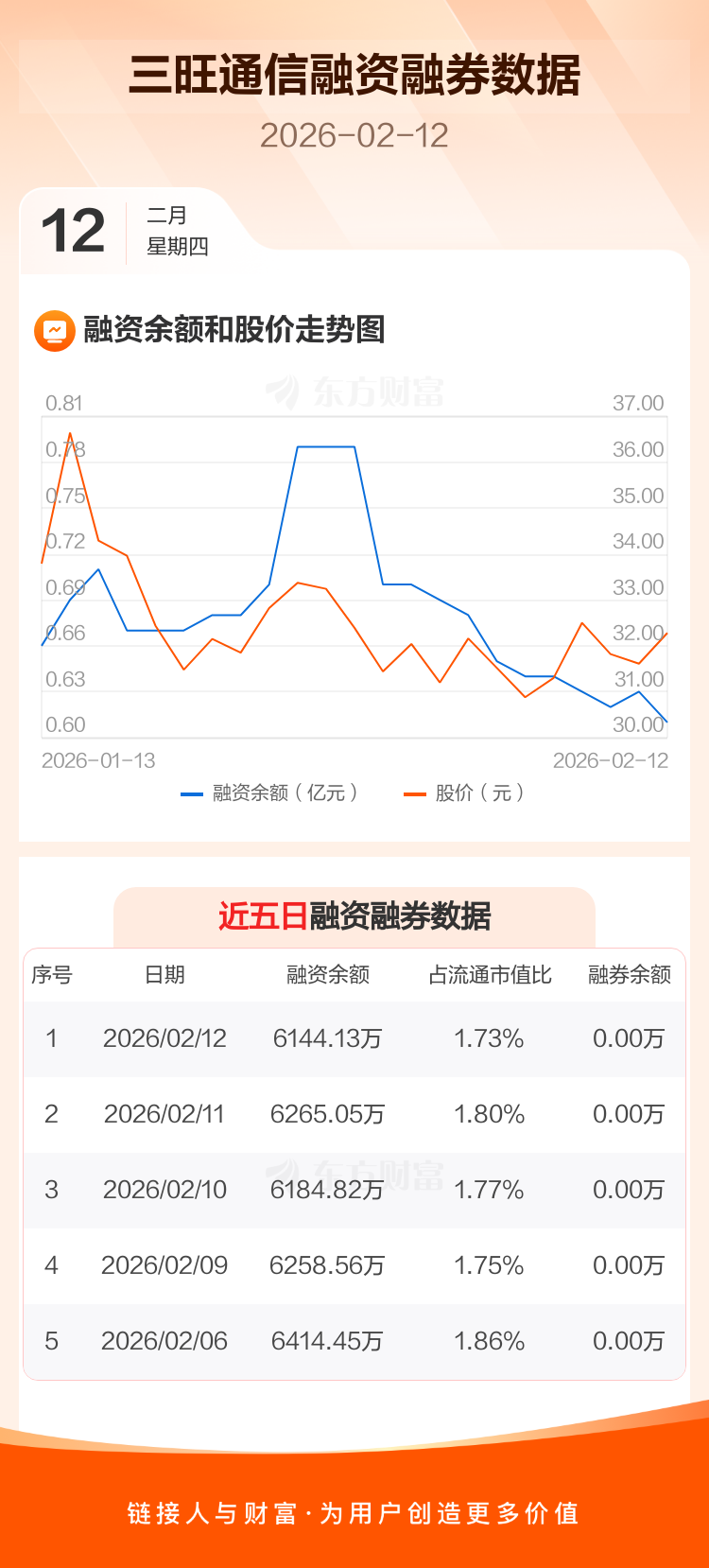 交易所最新数据显示,三旺通信于2026年2月12日获融资买入414.17万元,融资偿还535.08万元,当日融资净偿还120.91万元。目前,该股融资余额6144.13万,占流通市值比例为1.73%。