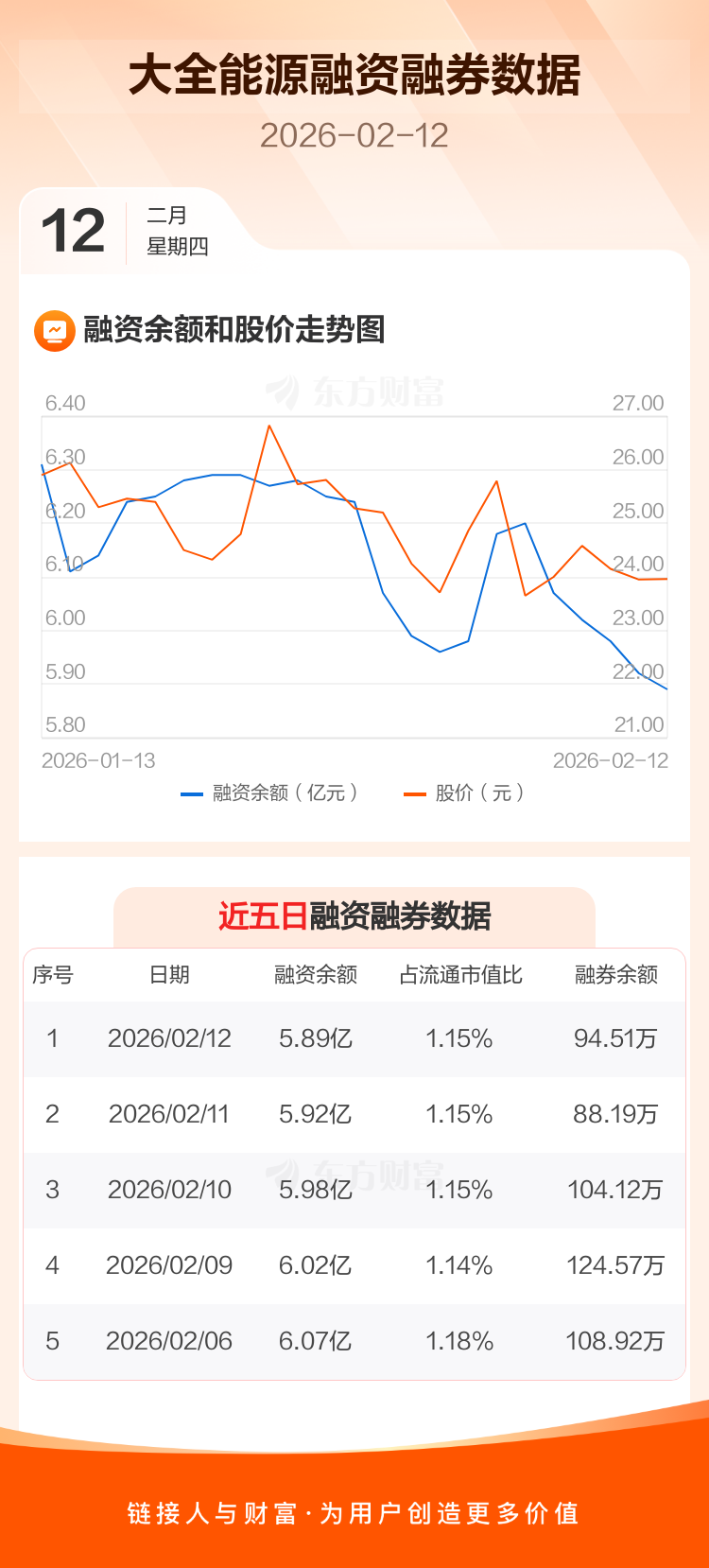 交易所最新数据显示,大全能源于2026年2月12日获融资买入1369.25万元,融资偿还1725.70万元,当日融资净偿还356.45万元。目前,该股融资余额5.89亿,占流通市值比例为1.15%。