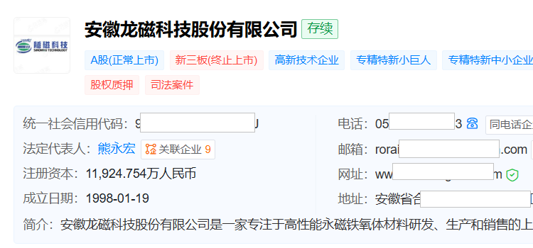 天眼查显示,龙磁科技成立于1998年1月,位于安徽省合肥市,2020年5月在深交所创业板上市,专注于高性能磁性材料与电子元件的研发、生产和销售,核心业务包括永磁+软磁+电感,是全球高性能永磁铁氧体湿压磁瓦主要生产企业之一。
