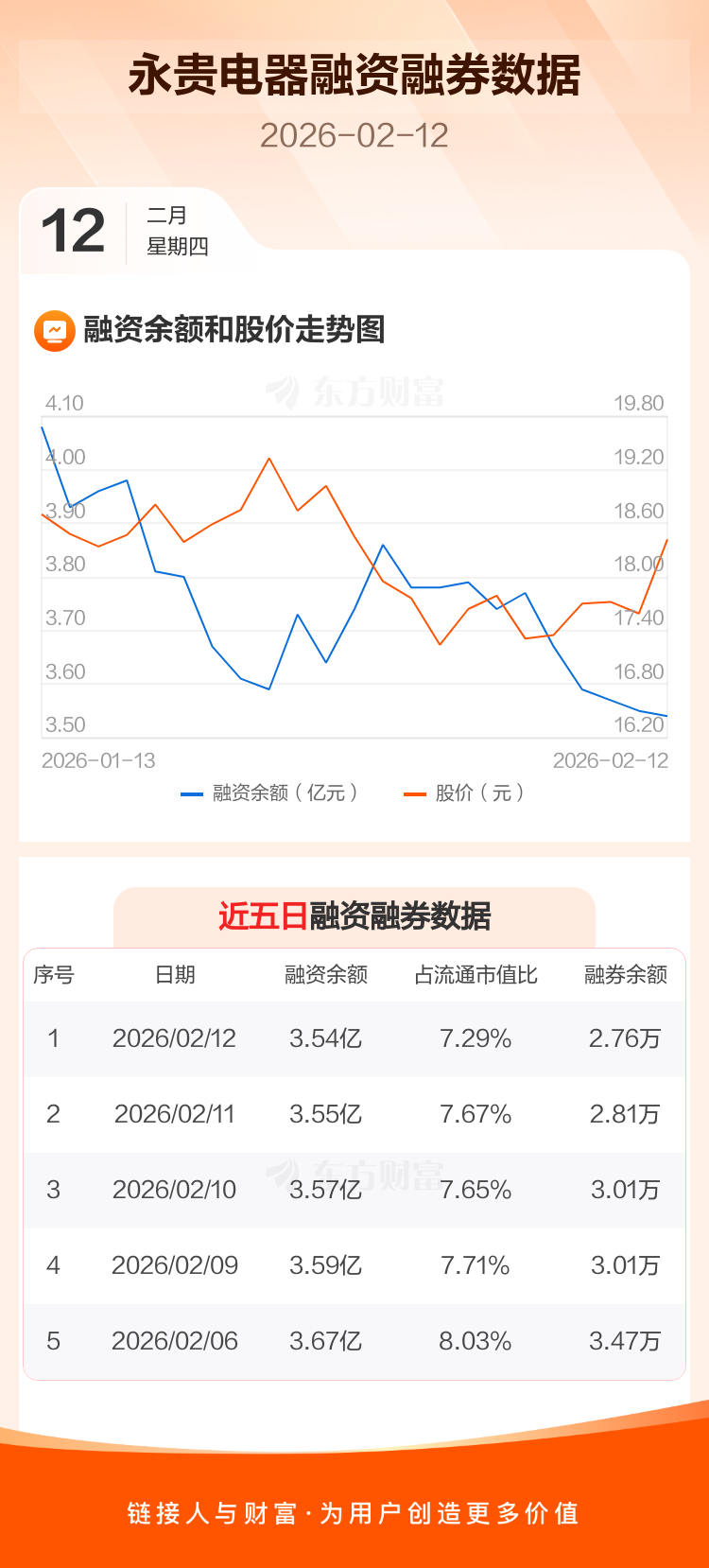 交易所最新数据显示,永贵电器于2026年2月12日获融资买入3766.97万元,融资偿还3923.05万元,当日融资净偿还156.08万元。目前,该股融资余额3.54亿,占流通市值比例为7.29%。