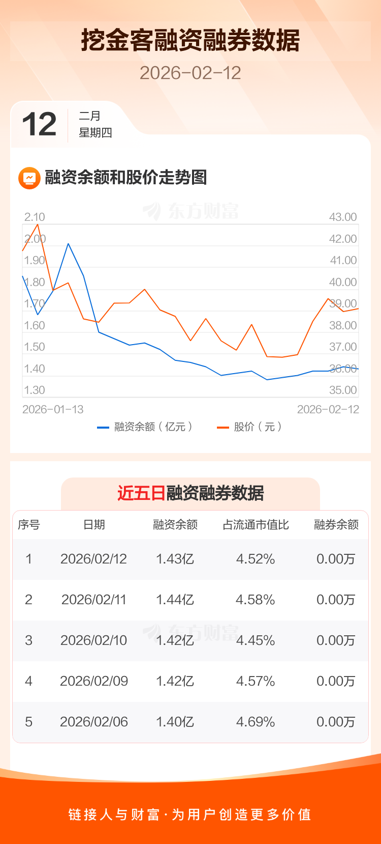 交易所最新数据显示,挖金客于2026年2月12日获融资买入1271.69万元,融资偿还1411.96万元,当日融资净偿还140.27万元。目前,该股融资余额1.43亿,占流通市值比例为4.52%。
