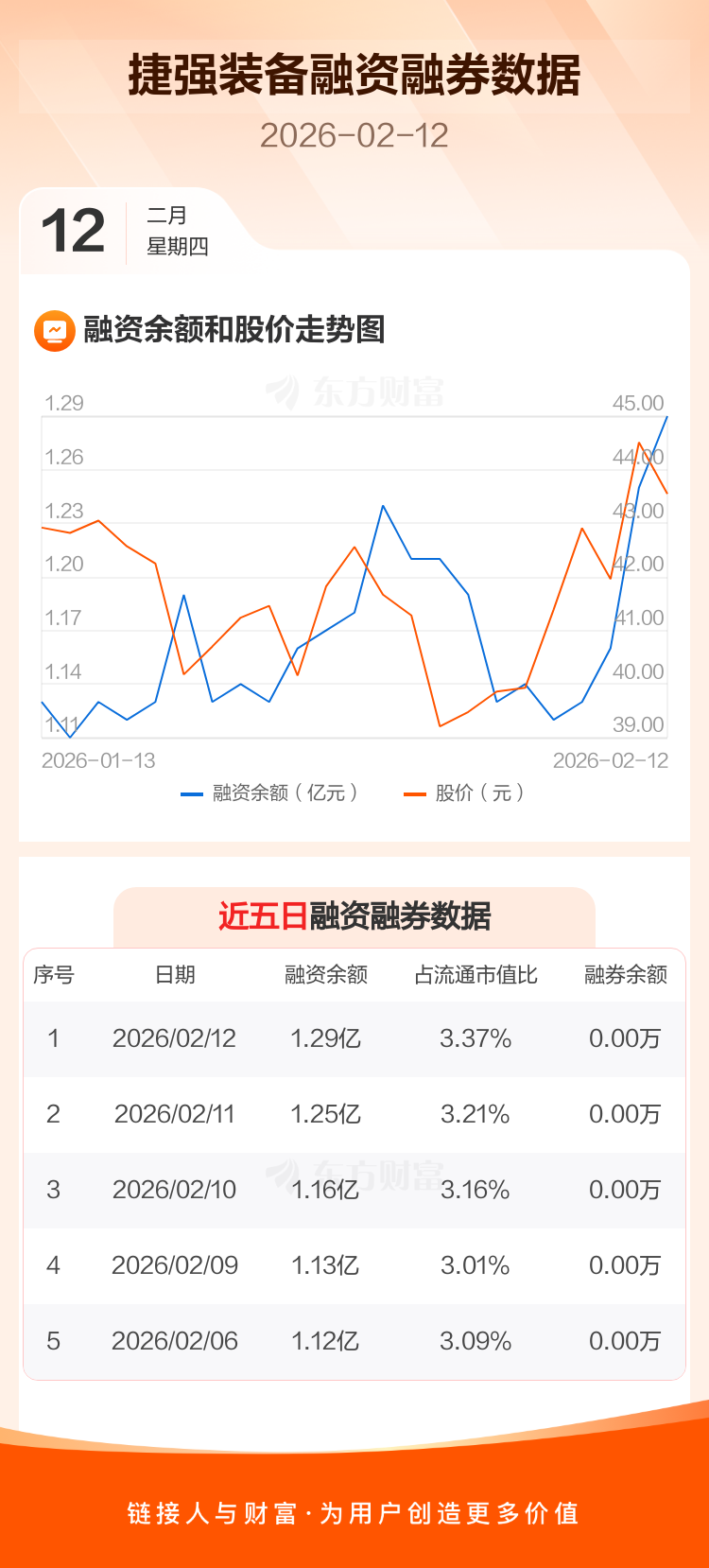 交易所最新数据显示,捷强装备于2026年2月12日获融资买入1453.24万元,融资偿还1100.29万元,当日融资净买入352.95万元。目前,该股融资余额1.29亿,占流通市值比例为3.37%。