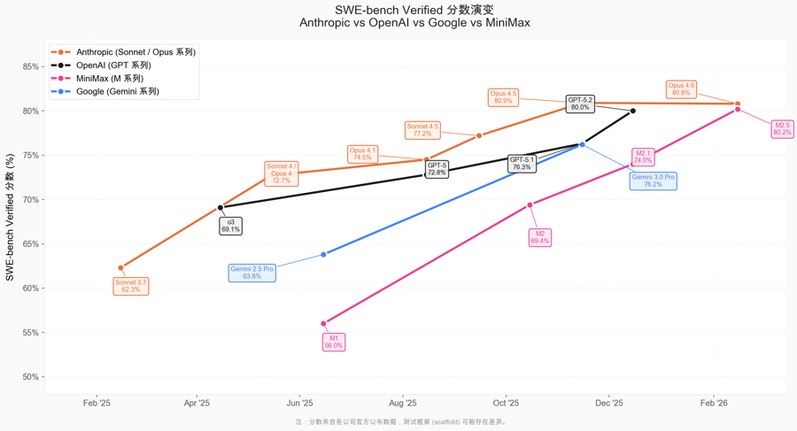 过去108天,MiniMax从M2、M2.1迭代至M2.5,在SWE-Bench Verified成绩从69.4提升至80.2,进步曲线在同业中尤为陡峭。团队将这一跃迁归因于大规模Agent强化学习(RL Scaling)。