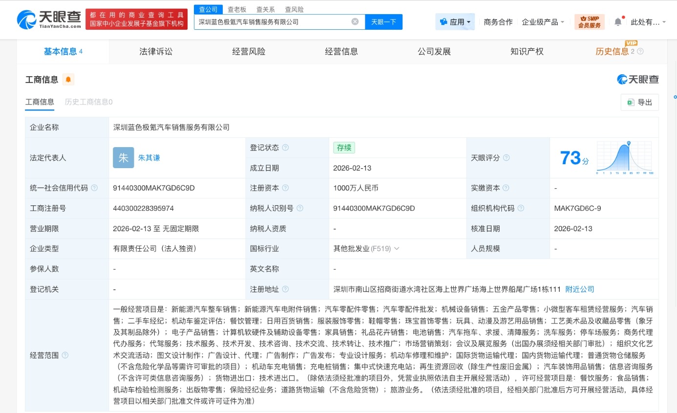 南方财经2月13日电,天眼查App显示,近日,深圳蓝色极氪汽车销售服务有限公司成立,法定代表人为朱其谦,注册资本1000万人民币,经营范围含新能源汽车整车销售、新能源汽车电附件销售、汽车零配件零售、汽车零配件批发、机械设备销售、五金产品零售、二手车经纪、机动车鉴定评估等。股东信息显示,该公司由浙江极氪汽车销售有限公司全资持股。