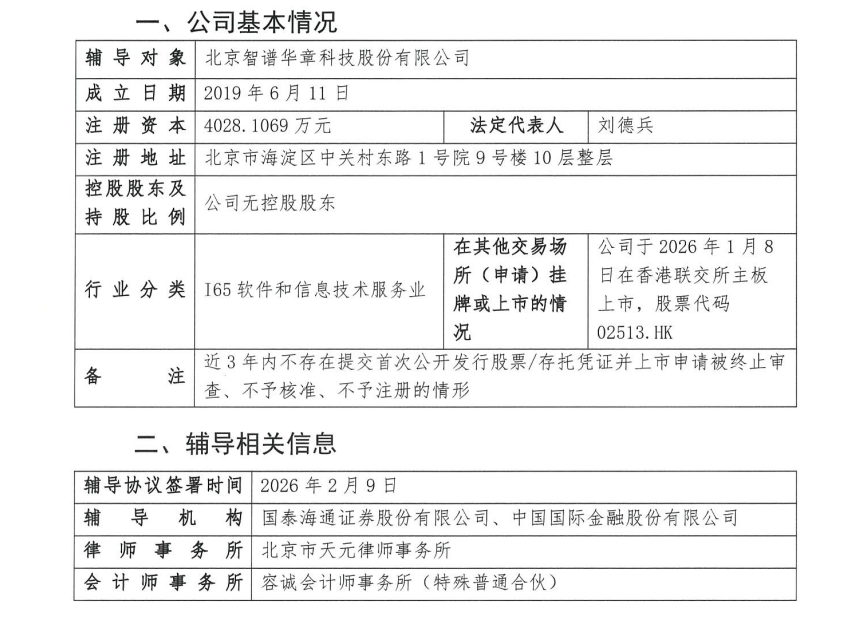 2月13日,证监会网站更新了智谱辅导备案信息。智谱撤回了其于2025年4月提交的辅导备案,并办理了新的辅导备案登记。该文件显示,智谱已聘请国泰海通、中金公司作为其首次公开发行股票并在上海证券交易所科创板上市的辅导机构,并分别与国泰海通、中金公司签署了《首次公开发行股票并上市辅导协议》,辅导协议签署时间是2026年2月9日。