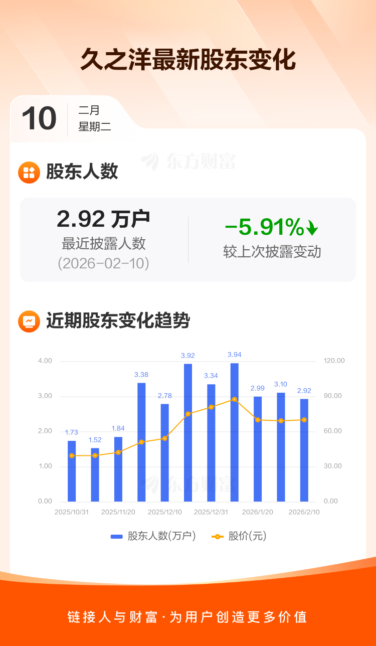 久之洋最新披露数据显示,截至2月10日公司股东户数为2.92万户,较上期(2026年1月30日)减少1832户,降幅为5.91%。户均持有流通股数量由上期的5802股上升至6166股,户均持股金额由上期的40.03万元增加至43.05万元。