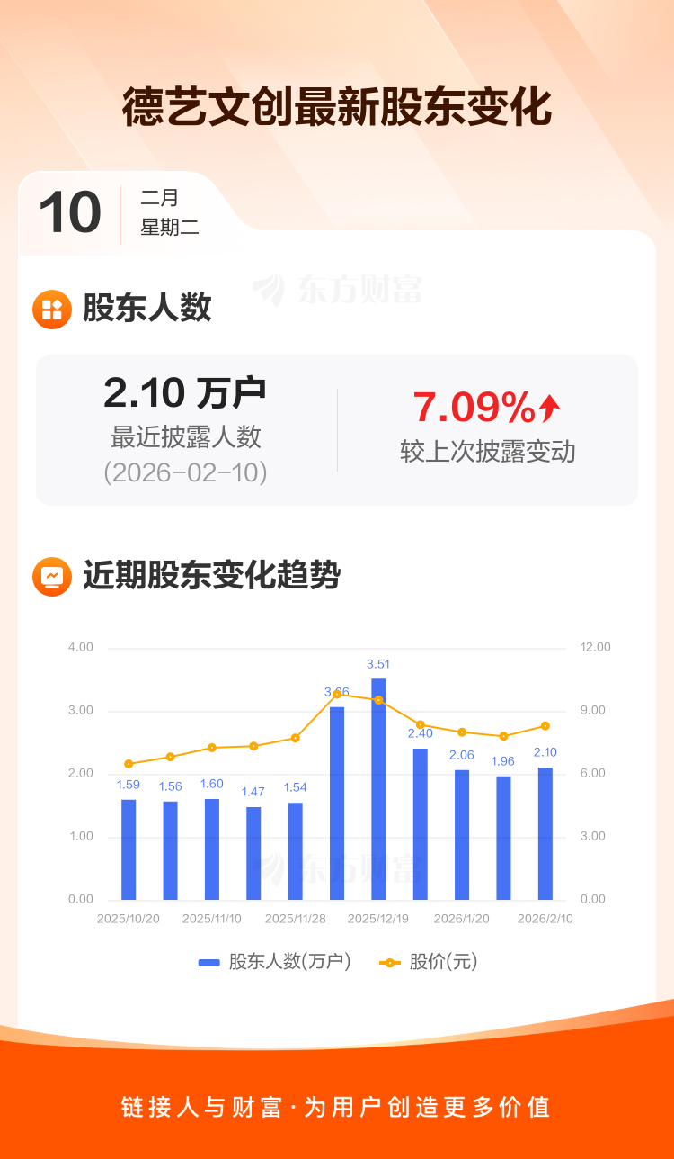 德艺文创最新披露数据显示,截至2月10日公司股东户数为2.10万户,较上期(2026年1月30日)增加1391户,增幅为7.09%。户均持有流通股数量由上期的1.12万股下降至1.05万股,户均持股金额由上期的8.76万元减少至8.70万元。