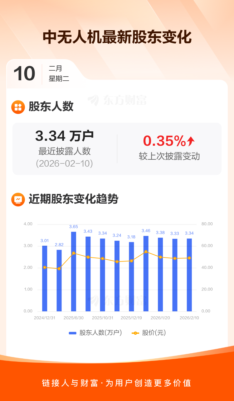 中无人机最新披露数据显示,截至2月10日公司股东户数为3.34万户,较上期(2026年1月30日)增加115户,增幅为0.35%。户均持有流通股数量由上期的2.03万股下降至2.02万股,户均持股金额由上期的98.52万元增加至98.90万元。