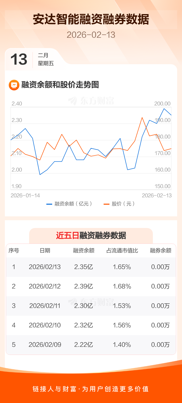 交易所最新数据显示,安达智能于2026年2月13日获融资买入1203.46万元,融资偿还1549.37万元,当日融资净偿还345.91万元。目前,该股融资余额2.35亿,占流通市值比例为1.65%。