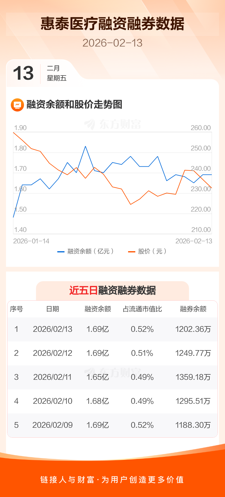 交易所最新数据显示,惠泰医疗于2026年2月13日获融资买入1022.26万元,融资偿还1001.30万元,当日融资净买入20.96万元。目前,该股融资余额1.69亿,占流通市值比例为0.52%。