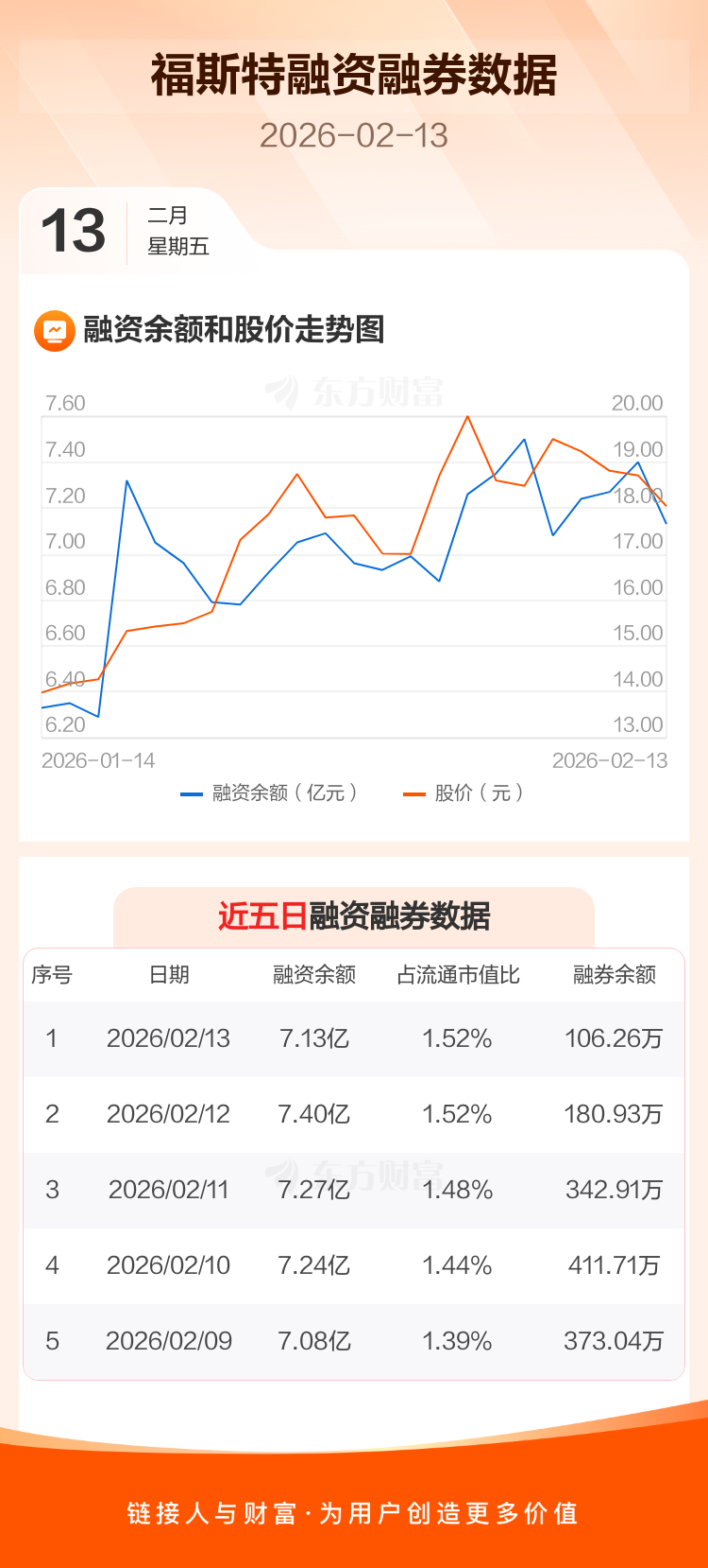 交易所最新数据显示,福斯特于2026年2月13日获融资买入4339.66万元,融资偿还6981.09万元,当日融资净偿还2641.43万元。目前,该股融资余额7.13亿,占流通市值比例为1.52%。