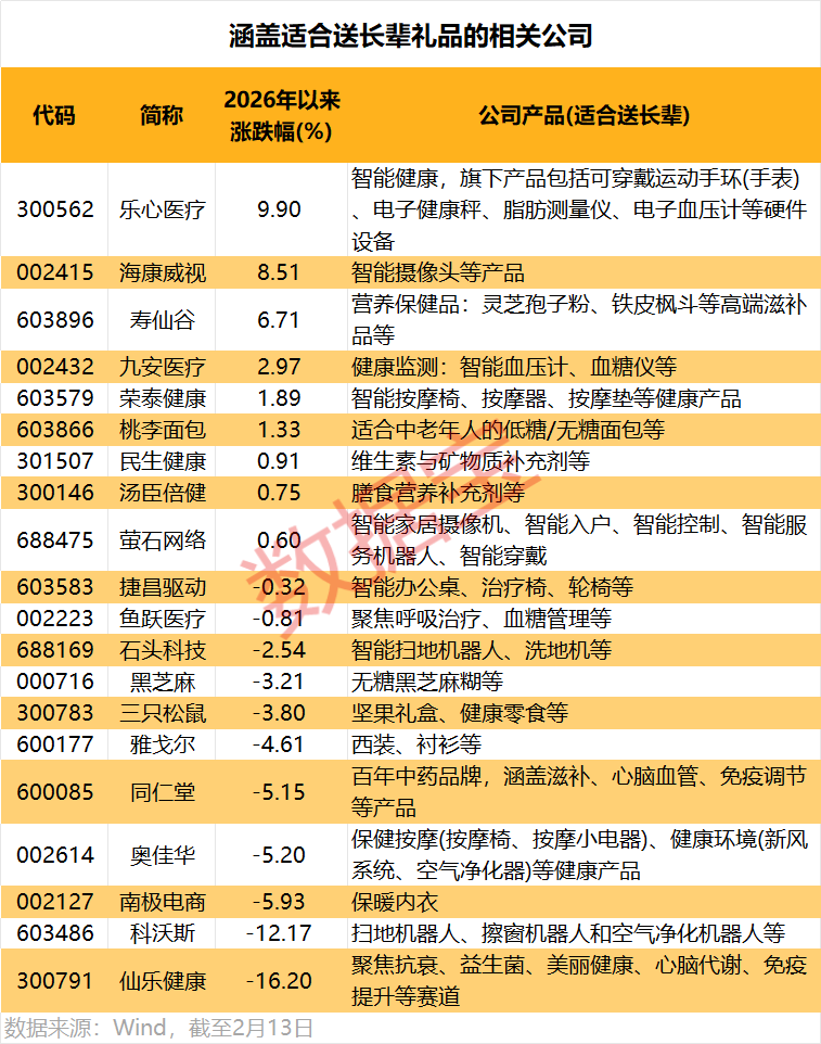 春节孝亲年货消费持续升温,哪些上市公司布局长辈礼品相关赛道?结合京东消费及产业发展研究院调查数据,记者梳理出A股市场覆盖营养保健品、健康监测、家务减负、按摩康复器械、服饰、特色食品六大领域的相关上市公司,共计20家。