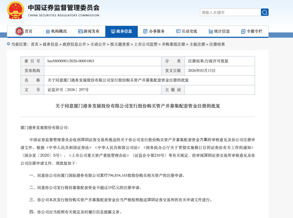 批复文件显示,证监会同意厦门港务向厦门国际港务有限公司发行7.97亿股股份购买相关资产的注册申请。同意公司发行股份募集配套资金不超过35亿元的注册申请。