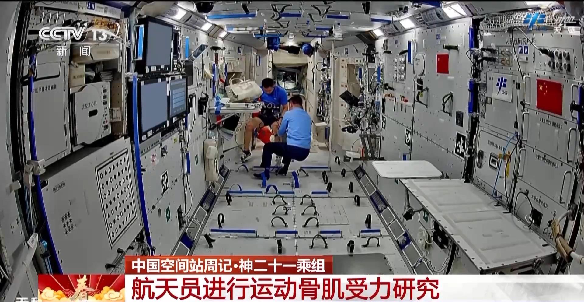 画面中,航天员正在进行运动骨肌受力研究相关工作,利用足底压力采集、贴片式超声等设备,采集飞行中不同负荷状态下跑步等运动状态下的足底压力、关节运动学数据和运动图像、相关肌肉参数,获取不同运动状态参数与足底压力的映射关系及肌肉-肌腱相互作用变化特征。