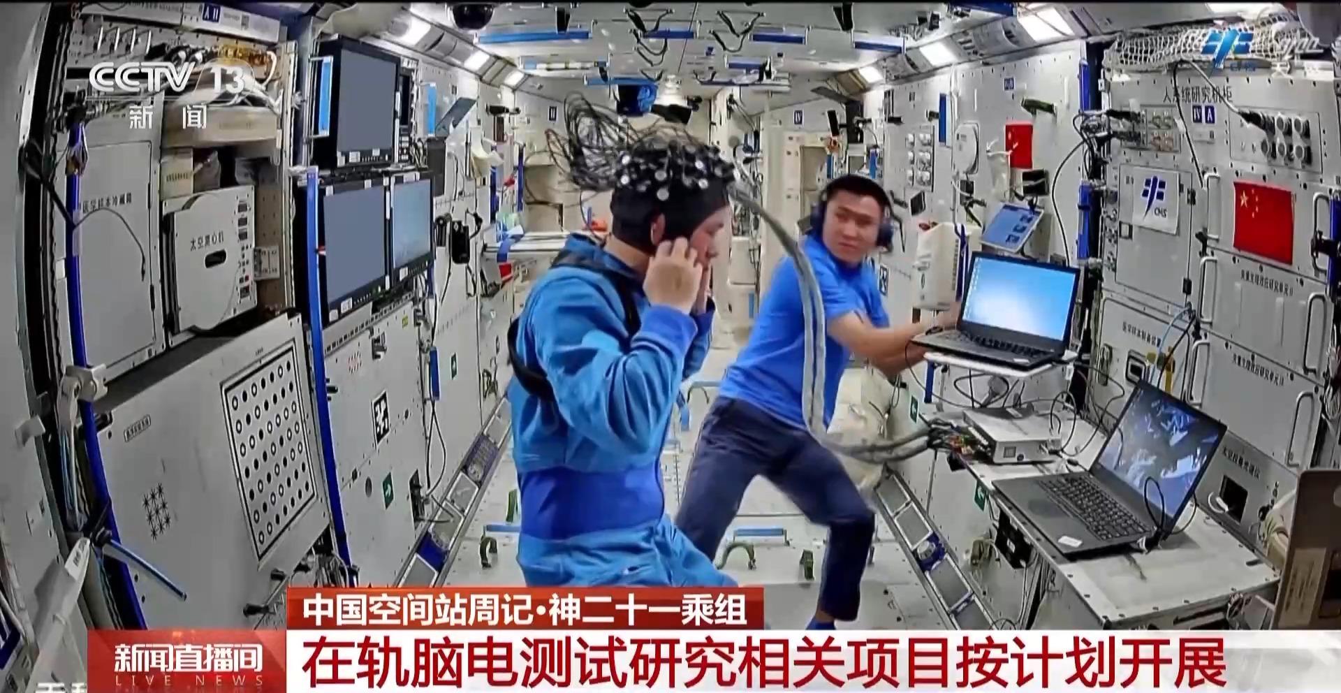 在轨脑电测试研究相关项目按计划开展,乘组使用近红外脑功能成像设备开展空间脑网络时变特性实验,开展长期空间飞行环境对航天员脑功能网络影响及大脑对外部环境变化进行的自发调整与适应机制研究。