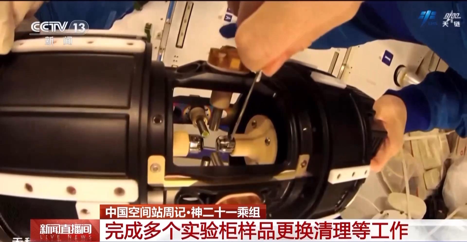 在微重力物理科学领域,根据实验安排,乘组完成了流体物理柜实验样品更换、燃烧柜实验插件更换,以及无容器柜实验腔体样品清理、轴心机构电极维护、视窗盖镜片清洁等多项工作。